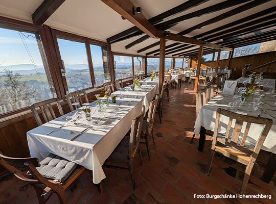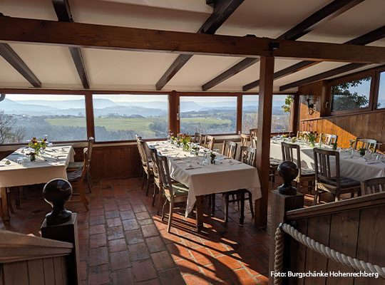 Hoch über Schwäbisch Gmünd, auf dem Hohenrechberg, liegt die Burgschänke mit weitem Blick über die Landschaft. Schon der Weg hinauf macht den Abend besonders – oben angekommen erwartet die Gäste eine Kombination aus historischem Gemäuer, gemütlicher Atmosphäre und beeindruckender Aussicht. Ein Ort, der Geschichte und Geselligkeit auf ganz eigene Weise verbindet.